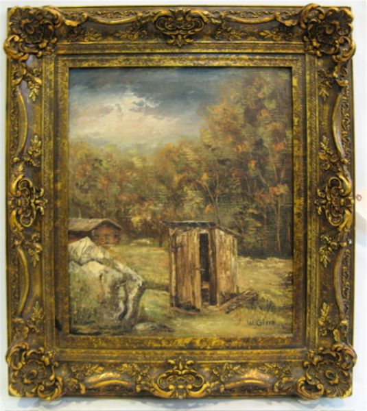 | An unusual rural landscape with log cabin and centered with an outhouse | |
