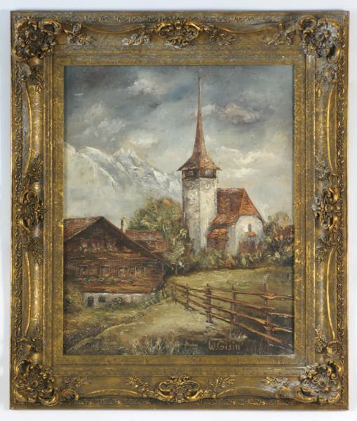 | Landscape with church and log cabin, split rail fence in foreground | |