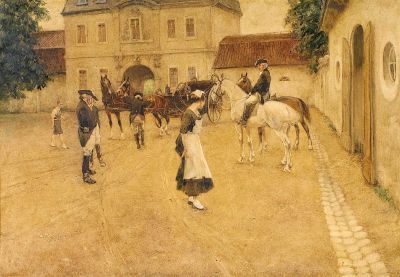 Wartende Kutscher im Gespräch mit dem Dienstmädchen