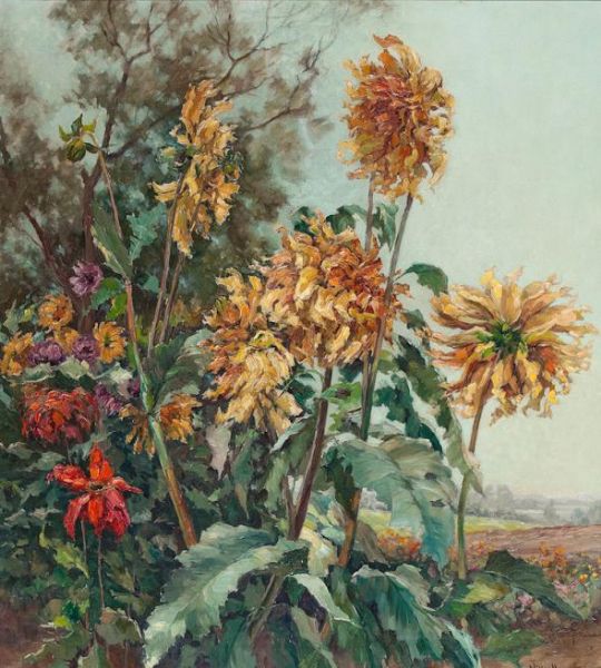 Verblühte Chrysanthemen vor Wiesenlandschaft