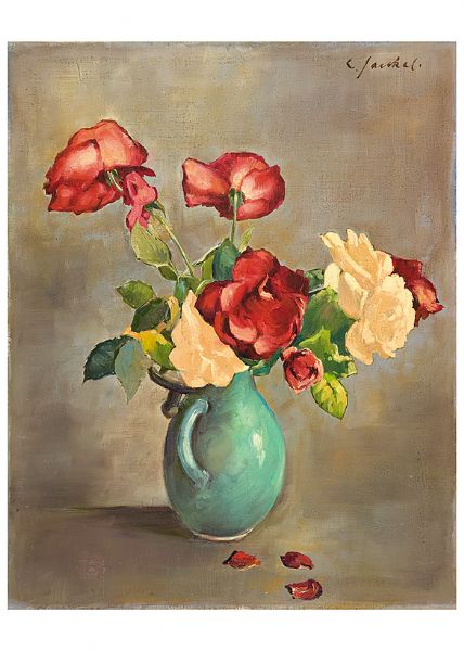Zwei erblühte Teerosen und vier rote Rosen in grünem Keramikkrug