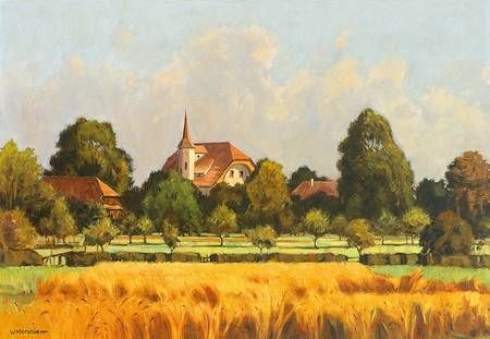 Sommertag auf dem Land mit Weizenfeld und Gehöften