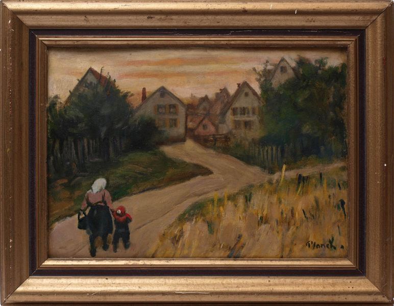 Spätsommerliche Partie auf der Schwäbischen Alb, im Vordergrund eine Mutter mit Kind, auf ein kleines Dorf zugehend