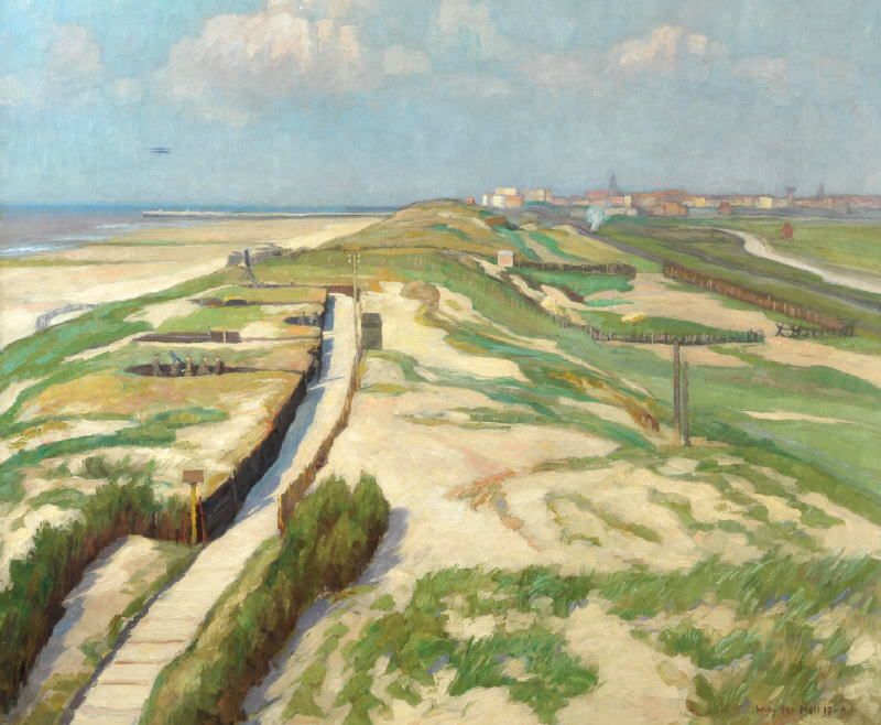 Küstenlandschaft mit Schützengraben und Flieger in der Normandie
