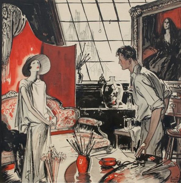 Illustration depicting an artist and female in his studio