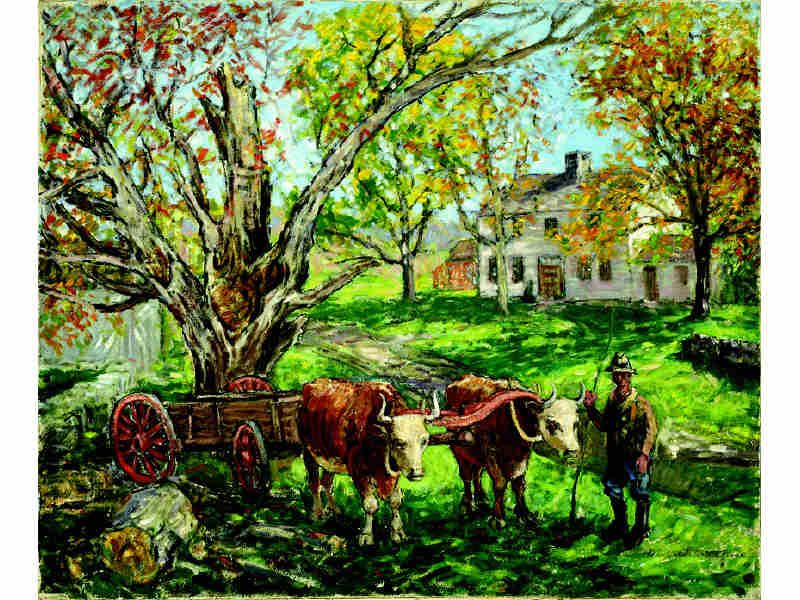 | Ox-drawn wagon with farmer in an Autumn scene | |