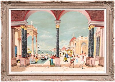 | Venetian festival, street vendors, acrobats, musicians, masked figures under double arch portico by the Grand Canal | |