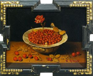 Still life of wild strawberries in a Ming bowl with carnation and cherries