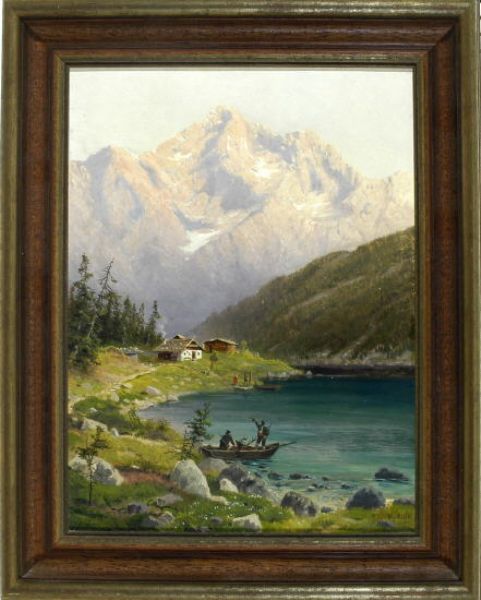 Jäger mit erlegtem Hirsch am Ufer des Eibsees mit Blick auf die Zugspitze