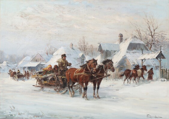 Sleighs in a village at winter time