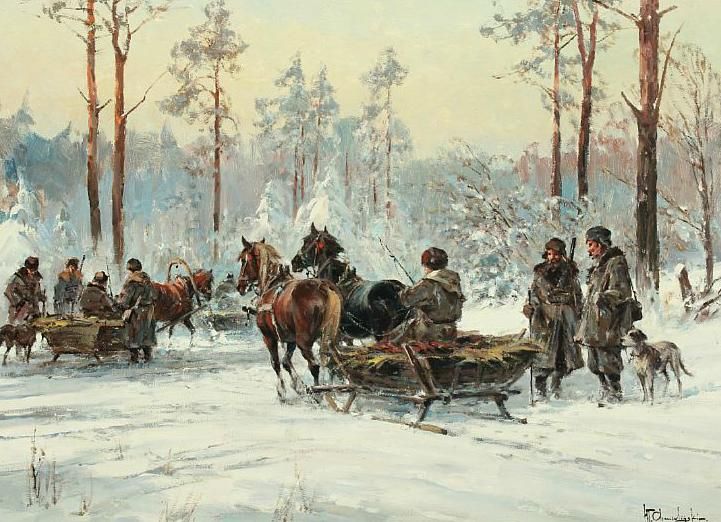 Wintry landscape with hunters in troikas