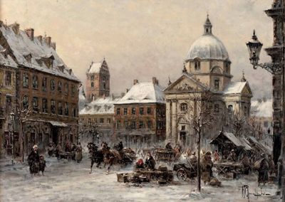 Winterlicher Stadtplatz mit Marktszene