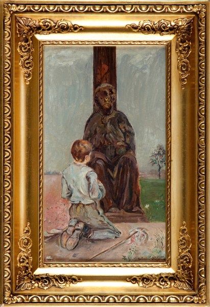 Chłopiec modlący się przed figurą Chrystusa