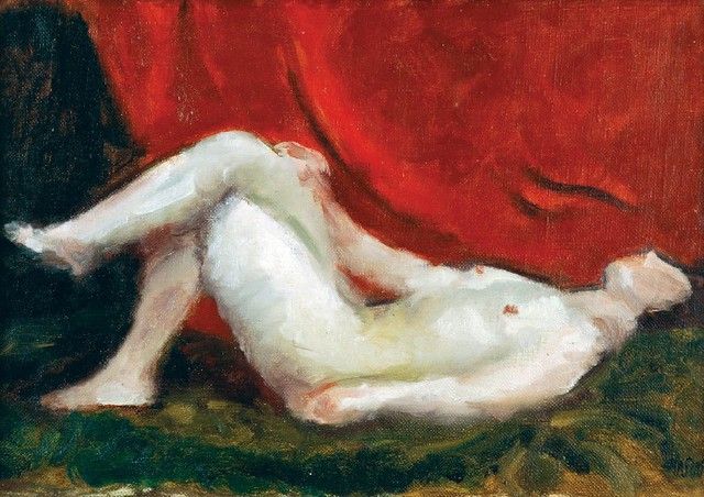 Akt na tle czerwonej draperii