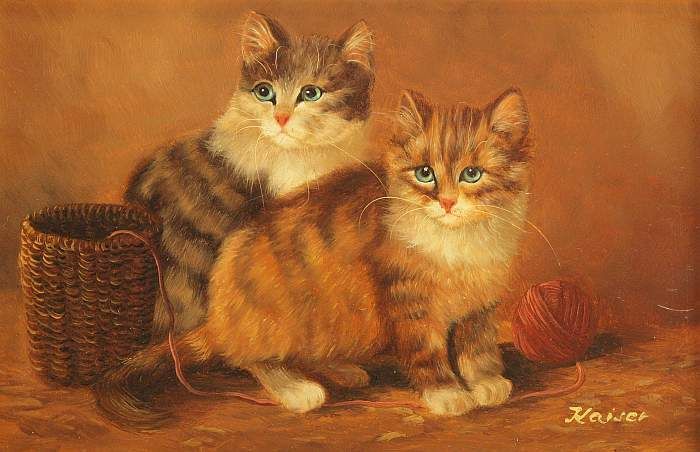 Zwei getigerte Katzen mit Wollknäuel spielend