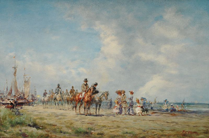 Reitergruppe und zahlreiche Personen am Strand an einem Sommertag