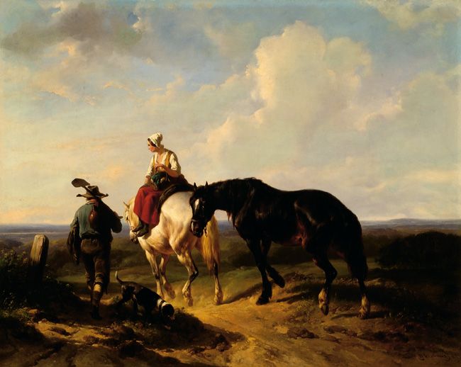 Travellers and horses on a sand road