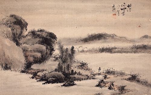 Flußlandschaft mit einem Spaziergänger auf einer Brücke.