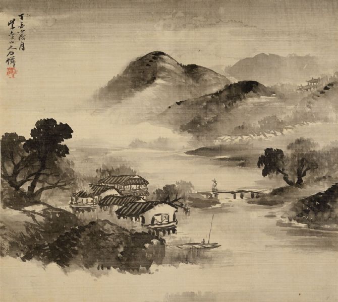 | Ink painting on silk. Hanging scroll, brocade mounting. | |