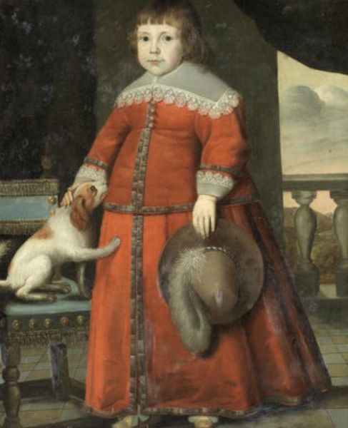 Portrait of a boy, full-length, in red costume, standing beside a spaniel on a terrace