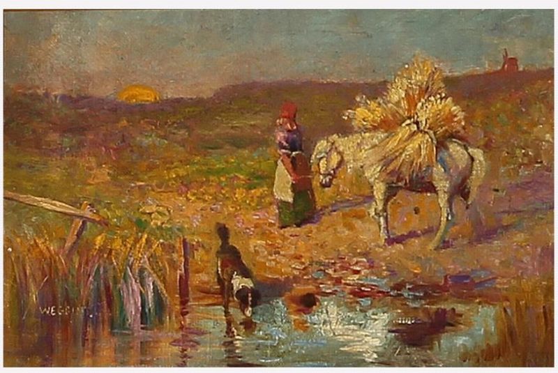 Southern landscape with a woman plus her donkey and dog