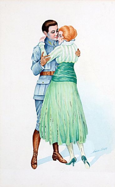 Four postcard designs of French soldiers in the embrace of their sweethearts