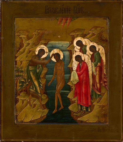 A DOUBLE-SIDED PROCESSIONAL ICON OF THE BAPTISM OF CHRIST AND THE PROPHET ELIJAH (GONFALON)