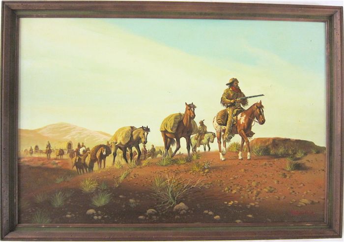 Wagon train passing through the desert.