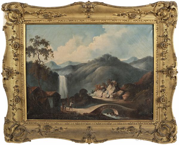 | figures crossing a bridge with a waterfall and mountains in the background | |