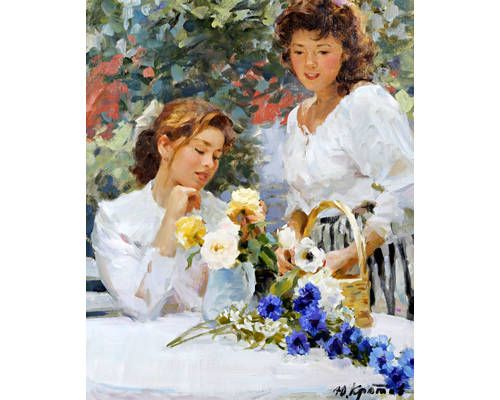 Young ladies arranging a vase of flowers