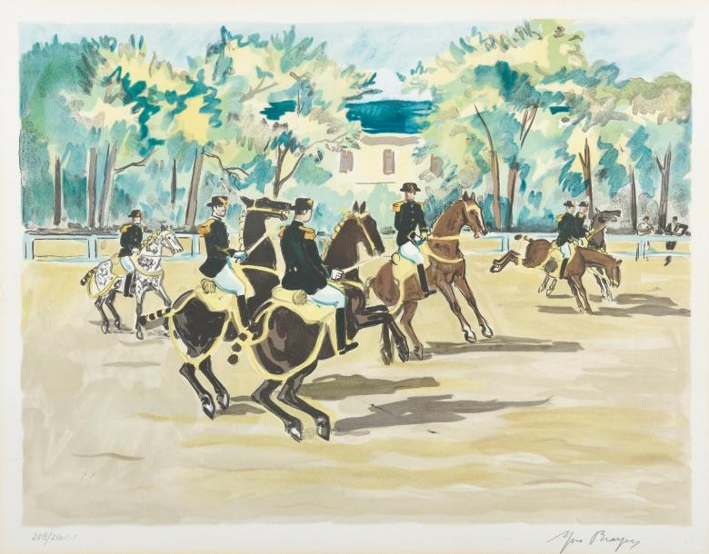 | Cavaliers en uniforme et chevaux de Camargue. | |