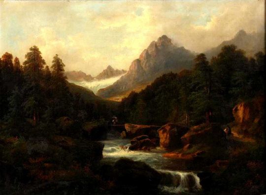 Extensive Mountainous River Landscape, with Figures crossing a Footbridge