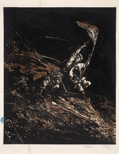 | Woodcut printed with water-soluble ink. | |