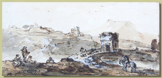 Figures fishing in an Italianate landscape, with ruined castles beyond