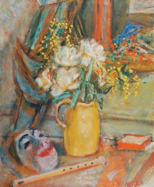 Martwa natura z kwiatami, maską i fletem