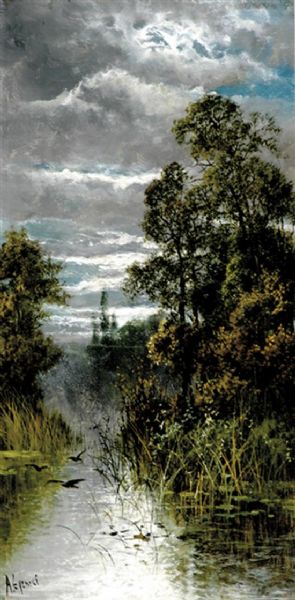 A Spencer ( 1860 - 1924 ) was a British painter. A Spencer s works have been put up for auction numerous times, with realized prices varying from 115 USD for Landscape with thatched roof cottages in 2005 to 550 USD for MOONLIT RIVER in 2008 , based on the size and medium of the artwork.