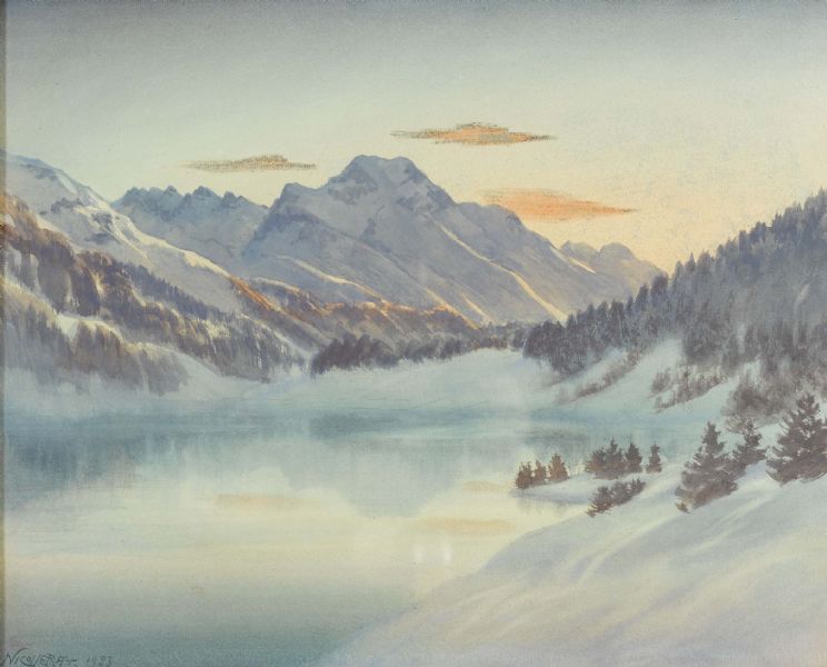 Aimé Félix Nicollerat ( 1876 - 1946 ) was a French painter. Aimé Félix Nicollerat s works have been put up for auction numerous times, with realized prices varying from 172.76 USD for On the Blue Nile in 2012 to 877.77 USD for Bergsee in verschneiter Landschaft. in 2013 , based on the size and medium of the artwork.