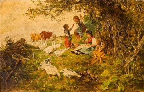 Antonio Montemezzo ( 1841 - 1898 ) was a German painter. Antonio Montemezzo s works have been put up for auction numerous times, with realized prices surpassing estimated prices, varying from 1071.55 USD for G√§nseherde am Fluss, im Hintergrund Dorfansicht. in 2004 to 28037.38 USD for LA CONTADINELLA in 2004 , based on the size and medium of the artwork.