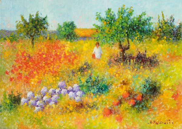 Antonio Pasciuti ( 1937 - ) is an Italian painter. Antonio Pasciuti s works have been put up for auction numerous times, with realized prices surpassing estimated prices, varying from 1243.16 USD for Glicini in 2005 to 1819.23 USD for Estate a Ginosa in 2006 , based on the size and medium of the artwork.