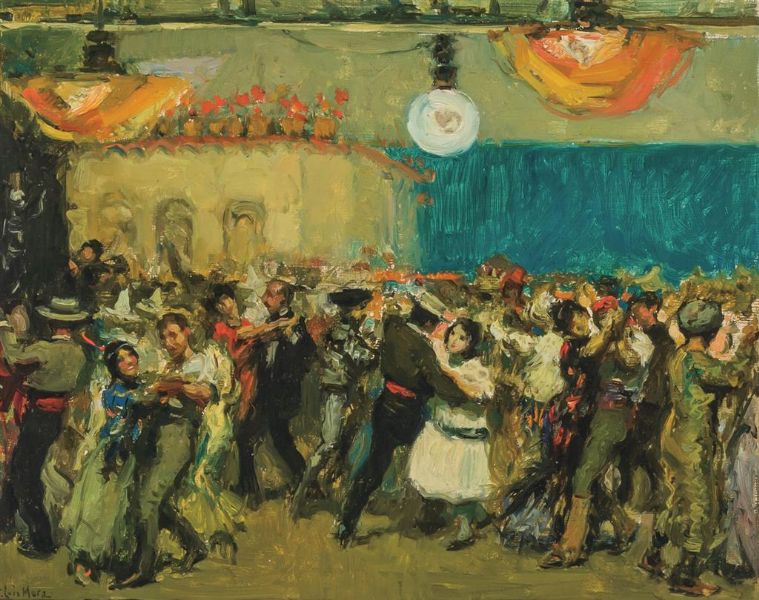 F Luis Mora ( 1874 - 1940 ) was a painter. F Luis Mora s works have been put up for auction numerous times, with realized prices surpassing estimated prices, varying from 211 USD for Print, Native American Family in 2012 to 6000 USD for Spanish Costume Ball at the Art Students League in 2015 , based on the size and medium of the artwork.