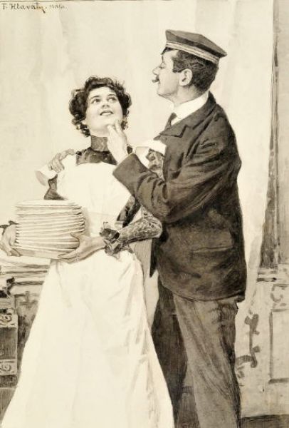 Frantiszek Hlavaty ( 1861 - 1917 ) was a painter. Frantiszek Hlavaty s works have been put up for auction numerous times, with realized prices varying from 84.26 USD for Dame richtet ihr Haar vor einem Spiegel in 2011 to 137.55 USD for Das galante Paar in 2012 , based on the size and medium of the artwork.