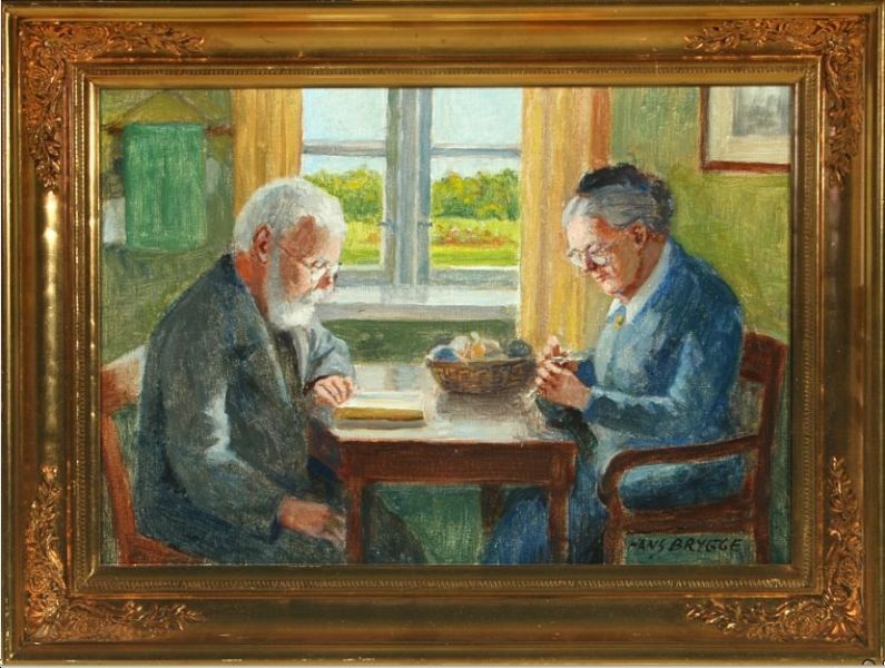 Hans Brygge ( 1885 - 1979 ) was a Danish painter. Hans Brygge s works have been put up for auction numerous times, with realized prices surpassing estimated prices, varying from 191.13 USD for Parkparti med tr√¶er. in 2004 to 263.77 USD for Portrait of a naked woman on the beach in 2005 , based on the size and medium of the artwork.