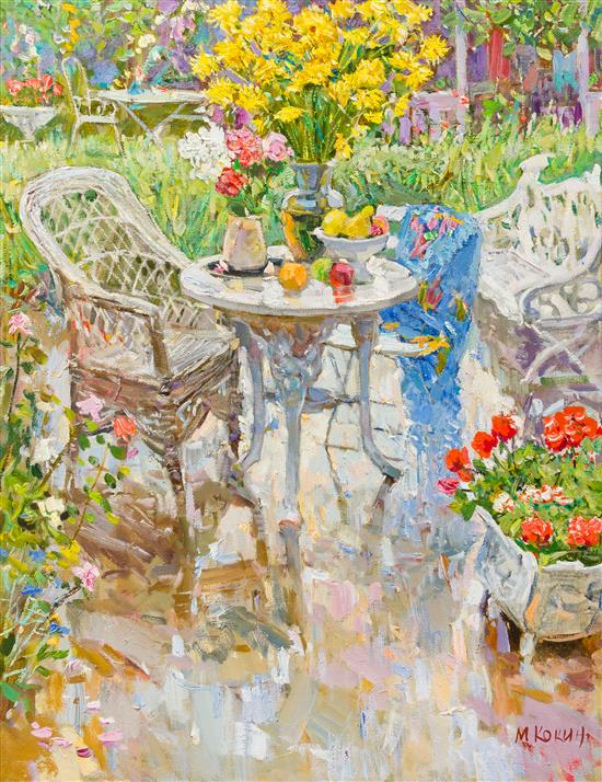 Mikhail Aleksandrovich Kokin ( 1921 - ) is a Russian painter. Mikhail Aleksandrovich Kokin s works have been put up for auction numerous times, with realized prices varying from 500.13 USD for A Garden in Autumn in 2012 to 1125 USD for After the Rain in 2016 , based on the size and medium of the artwork.