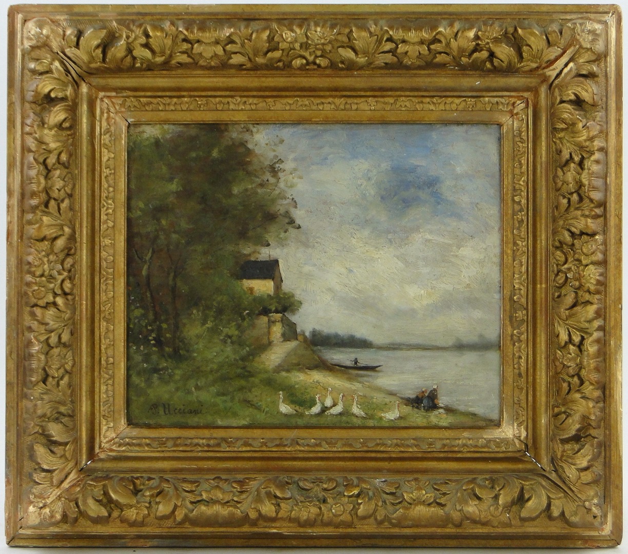 P Ucciani ( - ) is a painter. P Ucciani s works have been auctioned off multiple times, with realized prices varying according to the size and medium of the artwork, for instance of 155.2 USD for Geese and figures on a riverbank in 2016
