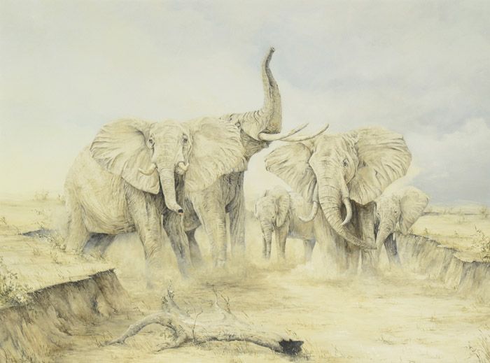 Tara Moore ( 1950 - ) is an American painter. Tara Moore s works have been put up for auction numerous times, with realized prices varying from 274 USD for Leopards in the Savannah in 2012 to 600 USD for African elephant herd stirring up dust. in 2013 , based on the size and medium of the artwork.