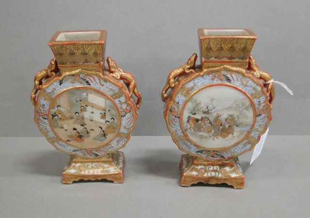 1 par vaser, Satsuma Japan, interiör och landskapsdekor, 1900-talets första hälft, en vas med fotlagning