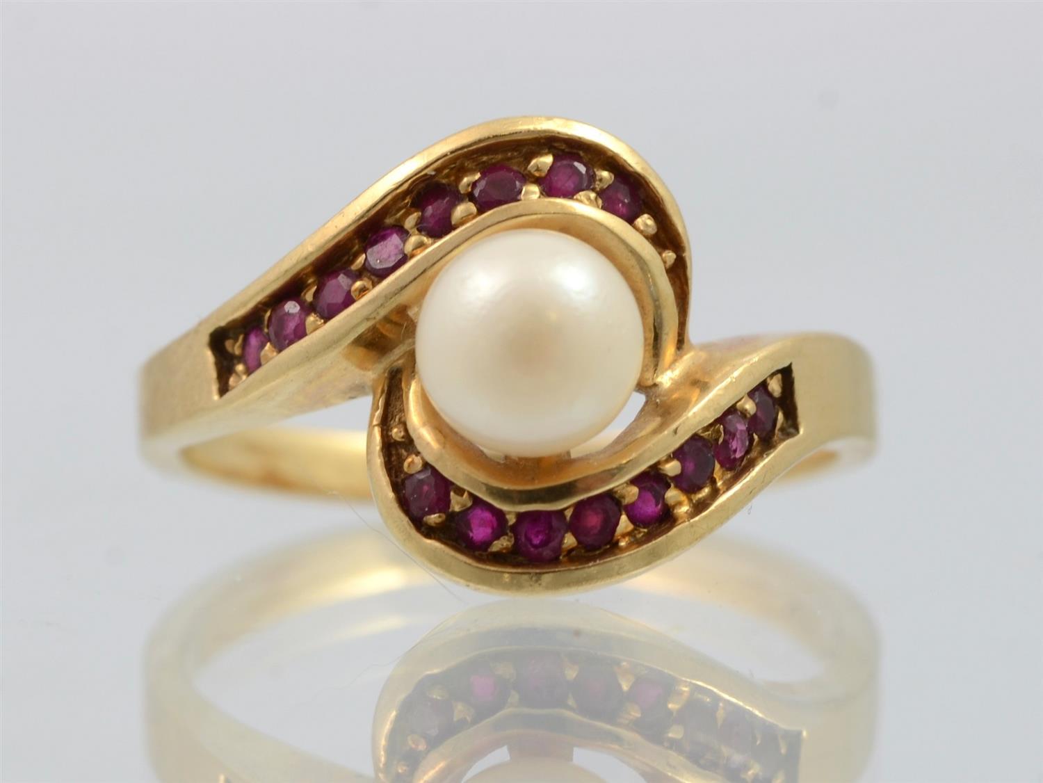 10K Yellow Gold, Pearl, and Ruby Ring, size 7-3/4, 2.2 dwt.