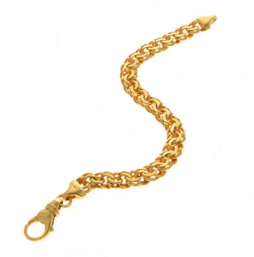 The 14k yellow gold fancy double link measuring approximately 9 mm, completed by a lobster claw clasp, forming a 7 3/4 inch bracelet. {Gross Weight: 19.0 dwts}