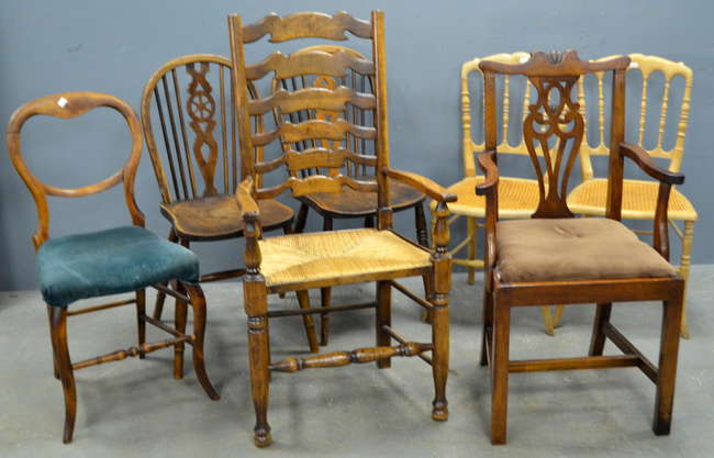 19th century mahogany armchair, oak ladderback armchair, two oak wheelback chairs and three bedroom chairs(7)