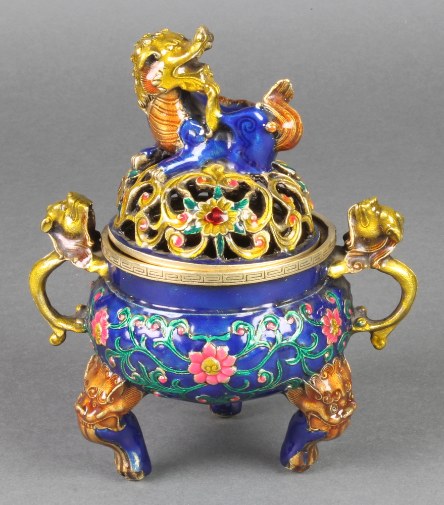 20th Century cloisonne style Koro and cover with Shi Shi finial and lion handles on mask knees with claw feet 7"